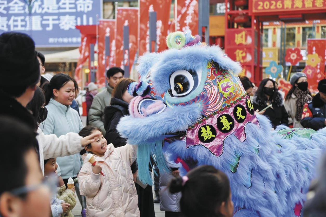 此外,一系列特色活動讓新春消費的場景更鮮活、更有趣。“酒韻青海·拳王爭霸”現(xiàn)場,市民們圍在一起看猜拳行令,喝彩聲此起彼伏,現(xiàn)場還能品鑒青稞酒、了解傳統(tǒng)釀造技藝;“匠心臻品·新春競拍”以一元起拍的方式,拍賣老字號產(chǎn)品、特色手工藝品,吸引了不少收藏愛好者參與;舞龍舞獅、民族歌舞、雪豹寧萌IP互動等街區(qū)巡演,讓整個商業(yè)步行街變成了沉浸式的新春體驗場,網(wǎng)紅打卡點前的一張張合影,定格了高原新春的熱鬧與美好。