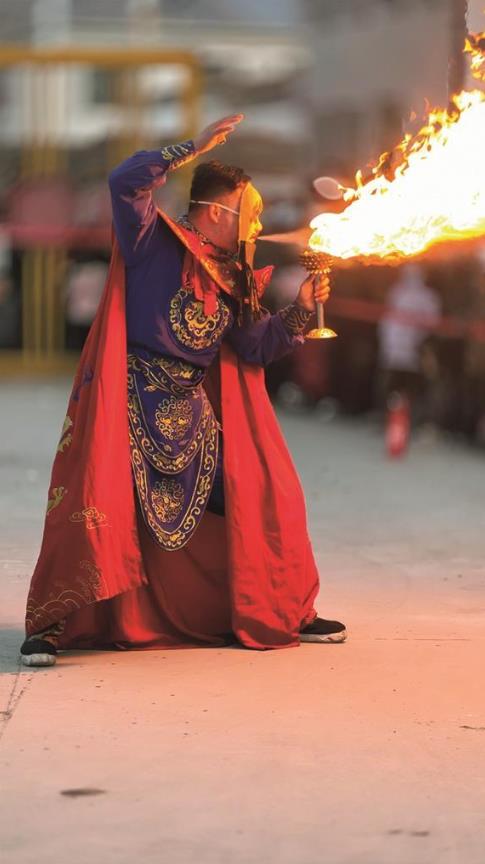 除了驚心動魄的打鐵花,孫長勝和伙伴帶來的火壺表演同樣吸睛,火焰與器具靈動配合,動作嫻熟流暢,盡顯民間技藝的魅力。變臉、醒獅等民俗絕活接連上演,為鄉(xiāng)村夜晚增添了濃濃的新春氣息。