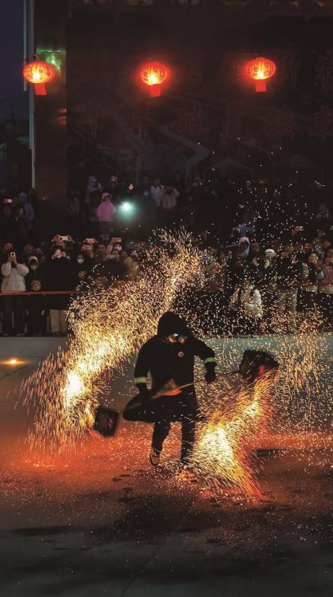 “起!”一聲吆喝聲下,孫長勝舀起熾熱的鐵水奮力拋向空中,另一人手持木板迅猛擊打。剎那間,鐵花凌空綻放,如流星破空,漫天火星流光溢彩,將夜空照得通亮。每一次驚艷綻放都引來全場歡呼,震撼的畫面讓觀眾沉醉不已。